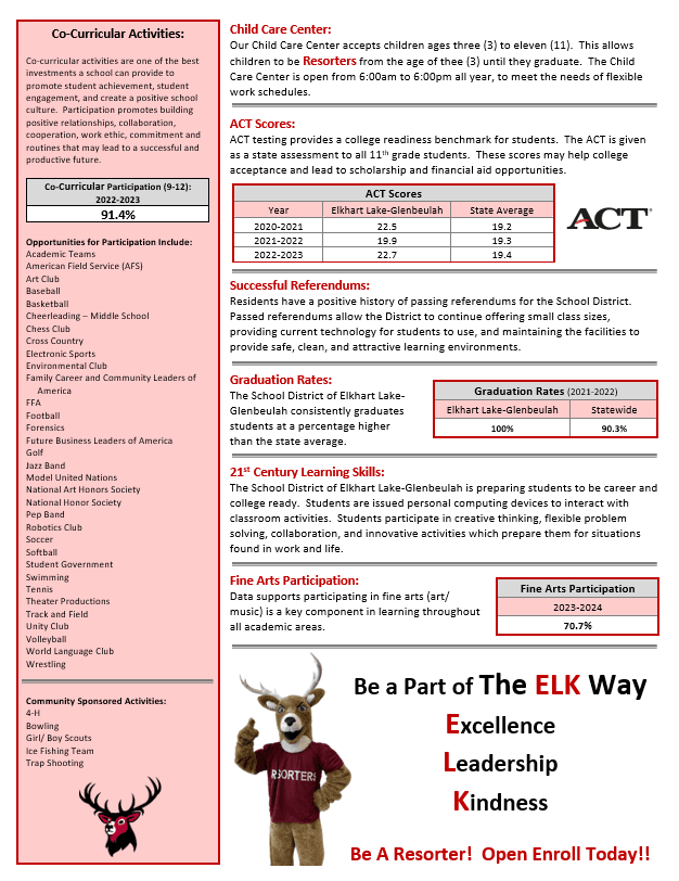 At Elkhart Lake-Glenbeulah schools, we pride ourselves in energizing the intellectual curiosity of our students. No matter the age, we get to really know our students and adapt to their individual needs. Students are tasked with activities tailored to stimulate both their minds and their bodies to continually achieve more. Our teacher-to-student ratio ensures we have the time with each child to inspire the confidence needed to exceed at almost every endeavor they're willing to try. And our entire staff encourages all of our students to try a number of different types of experiences: physical, social, and community-related.
